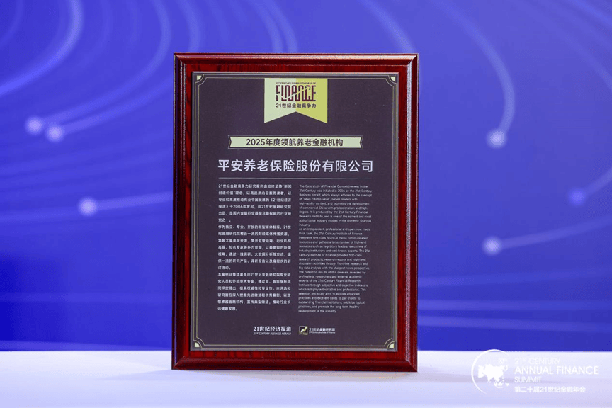 近日,为凝聚行业智慧、探寻发展新路径,由南方财经全媒体集团指导、21世纪经济报道主办的“第二十届21世纪金融年会”成功举办,会上同时公布了“2025年度21世纪金融竞争力优秀案例”,凭借在养老金融领域的卓越表现,平安养老保险股份有限公司(以下简称“平安养老险”)获“2025年度领航养老金融机构”荣誉。